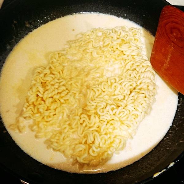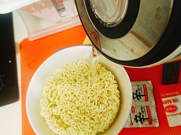 3.將辛拉麵(只泡麵條不要加任何調味包及辣包)加熱水泡開