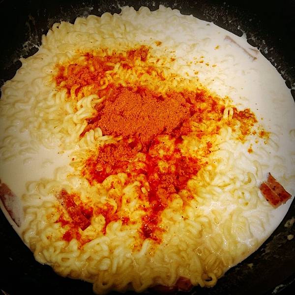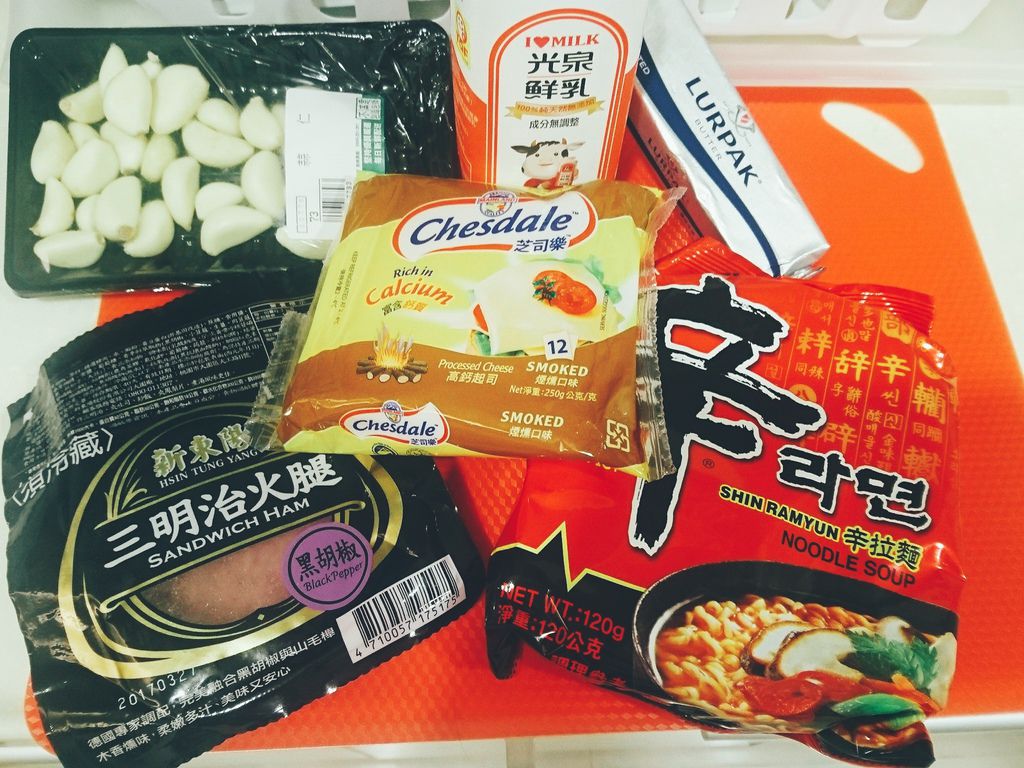 (自製版)食材:橄欖油→適量、蒜→適量、奶油→適量、煙燻火腿→1片、光泉牛奶330CC、起士1片、(農心)辛拉麵一包