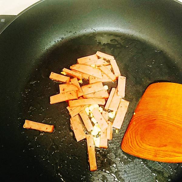 2.炒熟大蒜後,加入切成細絲的煙燻火腿(這邊在節目中是加入洋蔥和培根)