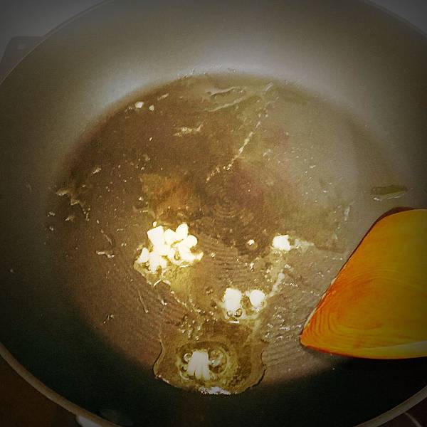 1.於平底鍋中加些橄欖油預熱,加入壓扁的蒜泥和奶油下鍋炒
